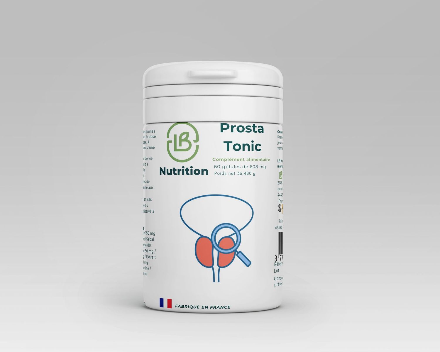 Poudre d’ortie piquante 150 mg / Poudre de baie de sabal Sabal 80 mg / Poudre de courge 80 mg / Poudre de maïtake 50 mg / Poudre d’épilobe 50 mg / Extrait de Sophora japonica 50 mg Dont 47.5 mg de quercétine / Extrait d’écorce de prunier d’Afrique 30 mg